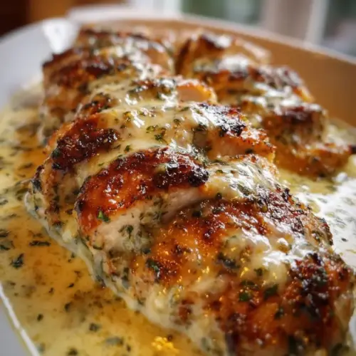 Baked Caesar Chicken with Creamy Parmesan Sauce is a delicious dish featuring tender chicken breasts baked with a creamy sauce made from Caesar dressing and Parmesan cheese, topped with breadcrumbs for a crispy finish.