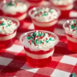 Festive gelatin shots made with cherry-flavored Jell-O, clear spirit, topped with whipped cream and crushed candy canes. A fun and flavorful treat for holiday gatherings.