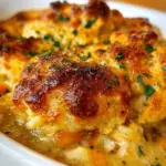 Cheddar Bay Chicken Cobbler is a savory dish that features shredded chicken and cheddar cheese, topped with a light, fluffy biscuit crust. It’s baked until golden and bubbly, offering a comforting meal ideal for any occasion.