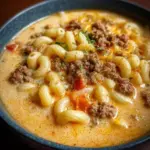 Cheeseburger macaroni soup is a hearty, creamy dish that combines ground beef, macaroni noodles, cheese, and vegetables in a savory broth. It offers all the delicious flavors of a classic cheeseburger in a comforting soup format.