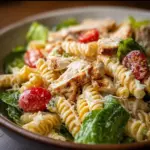 Chicken Caesar Pasta Salad is a delicious combination of pasta, grilled chicken, romaine lettuce, and Caesar dressing, offering a hearty yet refreshing dish ideal for various occasions.