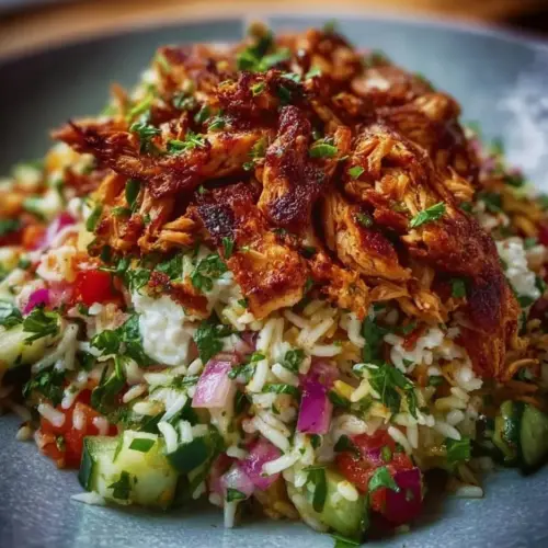 Chicken Shawarma Crispy Rice Salad combines savory, spiced chicken with a delightful blend of crispy rice and fresh toppings. It’s an easy Middle Eastern dinner recipe that warms the heart and satisfies the palate. With each bite, you experience a perfect balance of textures and flavors, making it a wonderfully vibrant dish that’s perfect for any occasion.