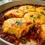 Chili cornbread casserole is a comforting dish that combines seasoned ground beef, beans, and vegetables simmered in a rich tomato sauce and topped with fluffy cornbread. It’s baked in one skillet for an easy and delicious meal.