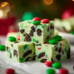 To make this fudge, you’ll melt white chocolate, mix in crushed Mint Oreos, add green food coloring, pour the mixture into a dish, decorate with M&Ms, and let it cool until firm.