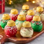 7. Add Toppings: While the chocolate coating is still wet, top each ball with a mini Reese’s cup and sprinkle some festive decorations on top. This step not only adds flavor but makes your treats visually appealing.