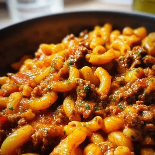 Comforting Beefaroni is a hearty dish made with ground beef, pasta, and a savory tomato sauce, reminiscent of classic home-cooked meals.