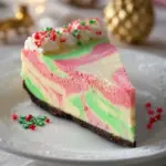 Creamy Christmas Cheesecake is a festive dessert made from cream cheese, sugar, and eggs, layered with vibrant red and green colors, set upon a graham cracker crust.