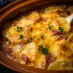 Serving this dish can be as festive or casual as you like. Set it out in the center of your dining table, allowing everyone to help themselves. You might want to pair it with a light salad or some steamed vegetables to balance the richness of the potatoes and ham. A dollop of sour cream or a sprinkle of fresh herbs on top can add an extra touch. You can also serve it as a hearty side alongside a simple grilled chicken or fish dish, making it a versatile addition to any meal. Leftovers can be reheated easily, and the flavors only develop more depth, making it even more enjoyable the next day.