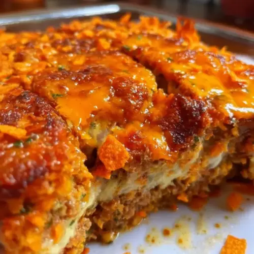 Dorito Meatloaf Casserole is a hearty dish that combines ground meat with crushed Doritos, cheese, and seasonings, baked into a comforting casserole.
