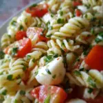 A delightful pasta salad combining fresh mozzarella, vibrant tomatoes, and fragrant basil, perfect for warm weather and gatherings.
