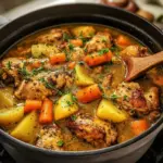 This stew combines tender chicken thighs with flavorful vegetables, all cooked in one pot, making it convenient and hearty, perfect for family dinners.