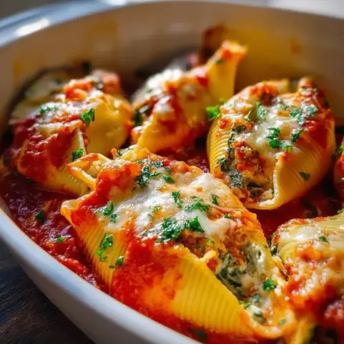 After filling the shells, pour the remaining marinara sauce over the top. Cover the dish with aluminum foil and bake for 25 minutes. Remove the foil, sprinkle a bit more mozzarella cheese on top, and return the dish to the oven for an additional 10-15 minutes, or until the cheese is bubbly and golden brown. Let the dish rest for a few minutes before serving.