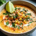 Mexican street corn soup is a creamy, flavorful dish inspired by elote, featuring sweet corn, roasted poblano peppers, onion, garlic, and a touch of lime.