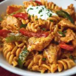 One-Pan Chicken Fajita Pasta is a delicious, easy-to-cook meal that combines chicken, pasta, bell peppers, onions, and creamy sauce into one pot for minimal clean-up.