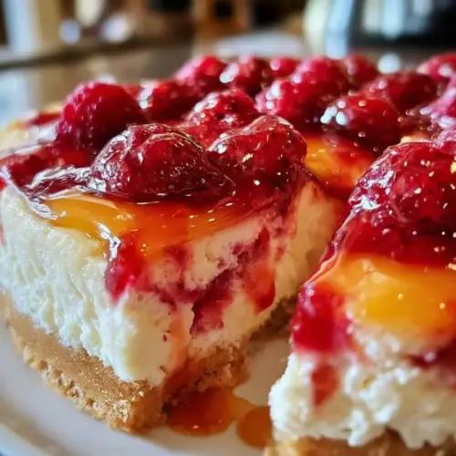 This Raspberry Peach Cheesecake stands out because of its harmonious blend of flavors and textures. The creamy cheesecake base provides a rich and satisfying bite, while the fresh raspberries and peaches add a burst of flavor that perfectly complements the creaminess. Each slice reveals a stunning display of color, making it a show-stopping dessert for celebrations or family gatherings. The simplicity of the ingredients paired with the heavenly taste makes this cheesecake a favorite among both seasoned bakers and novice cooks. Plus, it’s versatile enough to be enjoyed year-round, as you can use fresh fruits in season or frozen varieties when they’re not available. Your taste buds will thank you for indulging in this sweet, fruity delight.