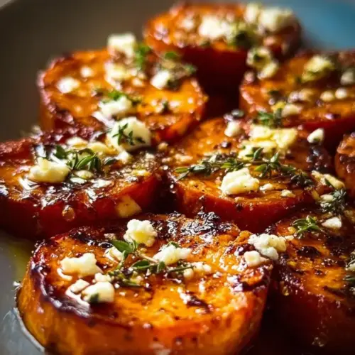 A delightful treat combining the natural sweetness of roasted sweet potatoes with creamy feta and a touch of honey, perfect as an appetizer or side dish.
