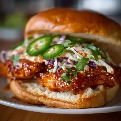 Spicy Bang Bang Chicken Sandwich Delight is a flavorful sandwich featuring crispy fried chicken cutlets topped with a spicy and creamy sauce, fresh vegetables, and served on a soft bun.