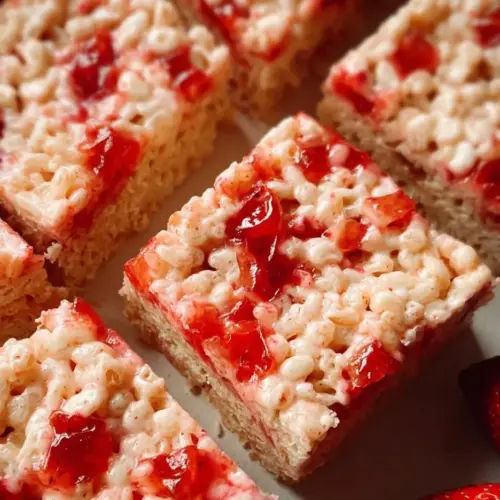 Strawberry Rice Krispie Treats are a sweet snack made from Rice Krispies cereal, melted marshmallows, butter, and fresh strawberries, combining crunchy and chewy textures.