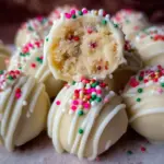 Sugar Cookie Truffles are bite-sized desserts that combine crushed sugar cookies and cream cheese, coated in melted vanilla or white chocolate, and decorated with sprinkles.